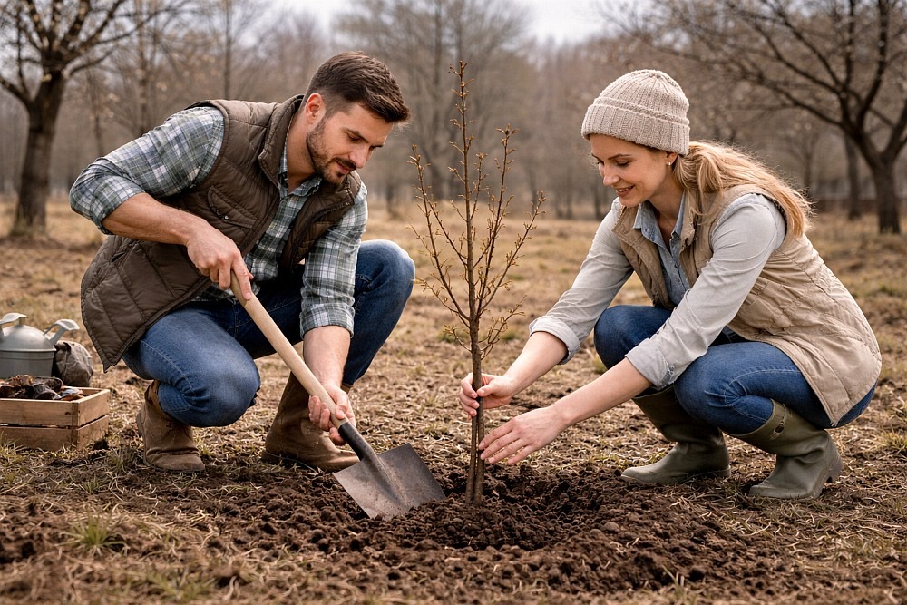 Zatímco ovocné stromy prodávané prostokořenné jsou obvykle vyorané na podzim a měly by se sázet hned na podzim nebo následující jaro (později už kořeny usychají), kontejnerové nám dávají více možností. Lze je vysazovat od jara prakticky až do doby, kdy zamrzne půda. Podíváme se na základní tipy pro sázení a volbu správného typu sazenice. Podrobnější informace o druzích a podnožích najdete v článku o tom, jak a kam se sází jednotlivé druhy ovocných stromů.